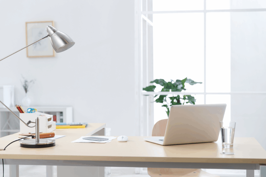 Le bureau doit être placé perpendiculairement à la fenêtre pour bénéficier de la lumière naturelle sans reflets sur l’écran. Il est possible de compléter avec une lampe orientable (température neutre 4000-4500K pour un usage standard, jusqu’à 5000K pour des tâches très précises).
